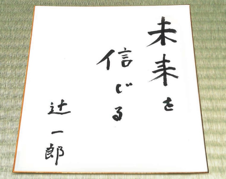 座右の銘として書いていただいたのは、立命館大学の末川博名誉総長の言葉 、「未来を信じ、未来を生きる」の前半だとのこと。辻さんは京大時代、非常勤講師で来られていた末川先生のとても楽しい授業を受けられたとのことでした。