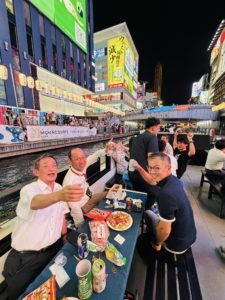 道頓堀付近ではネオンや提灯が灯り、橋の上や川沿いから観光客の方と手を振り合うなど、
